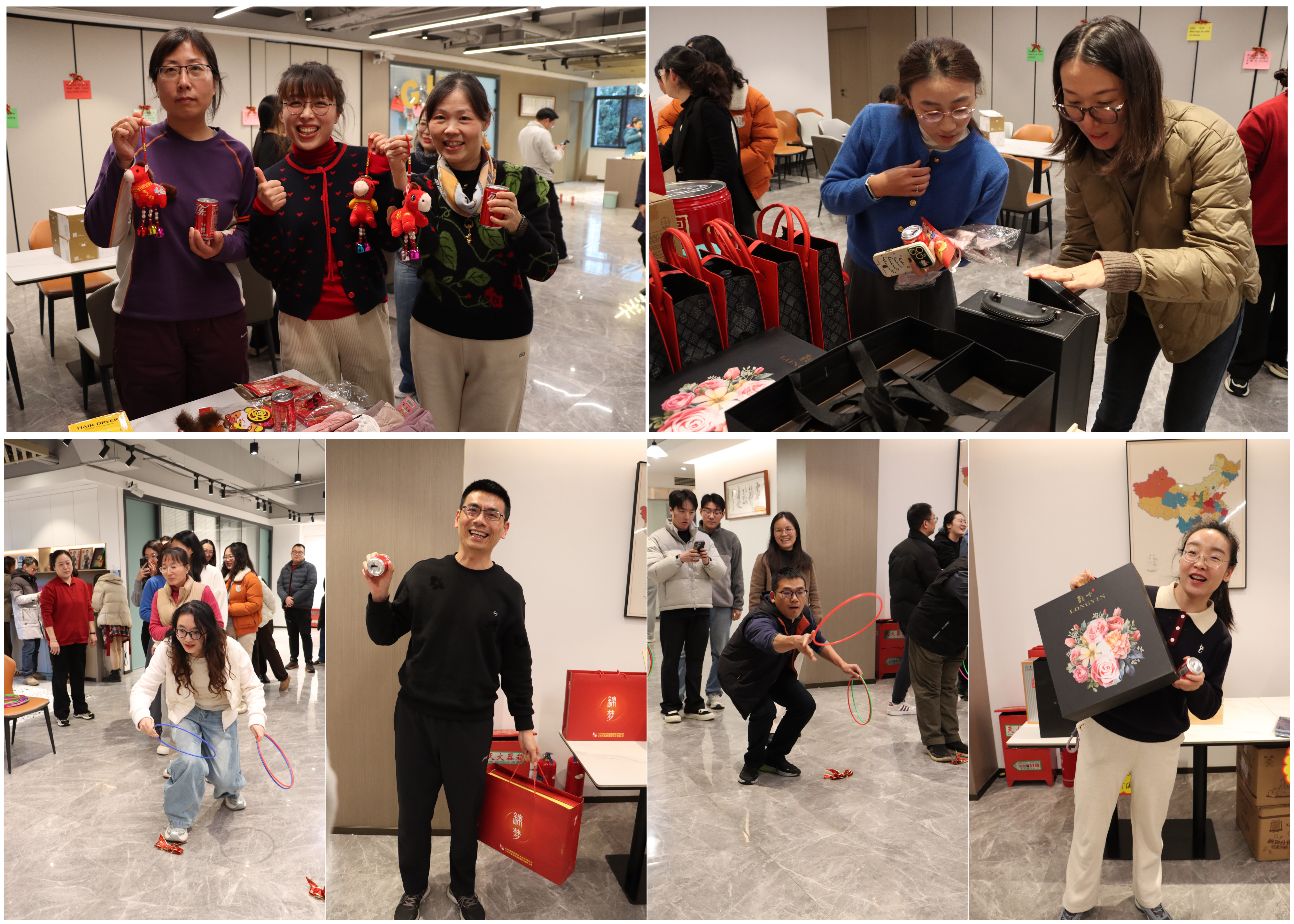 套圈贏好禮活動率先點燃現場歡樂,活動區域內,一瓶瓶可樂整齊擺成大大的「GHW」英文字母形狀,豐富多彩的實用禮品整齊陳列。員工們秩序井然地排隊參與,每人手持3個套圈,眼神專注瞄準目標,滿是期待。瞄準、投擲、命中!現場不時響起輕快的歡呼與歡笑聲,「100%中獎」的設置讓每位參與者都滿載而歸,為節日增添了別樣趣味。
